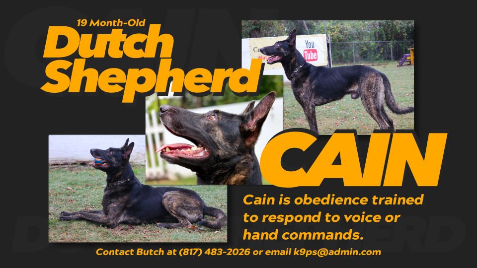 Cain is obedience trained to respond to voice or hand commands. He’s also available with a security dog training program at an additional charge. Contact me at (123) 456-7890 or email email@business.com.