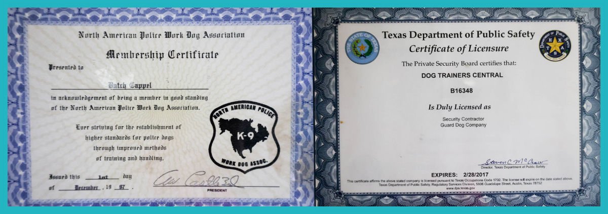 Butch Cappel is licensed by the State of Texas, and the State of Chihuahua, Mexico, to train and procure police and security dogs and dog teams.