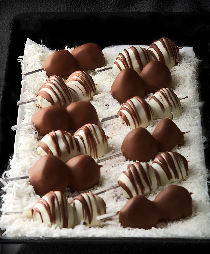 - 3 fruits on a skewer layered with 2 chocolate choices (substitutions such as creme puff, brownie, banana or pineapple included)