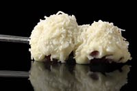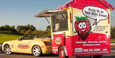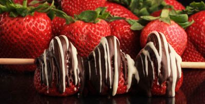 Two skewered strawberries lavishly drizzled with Milk, Dark, or White chocolate enhanced with