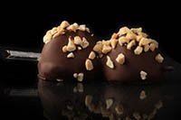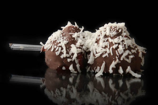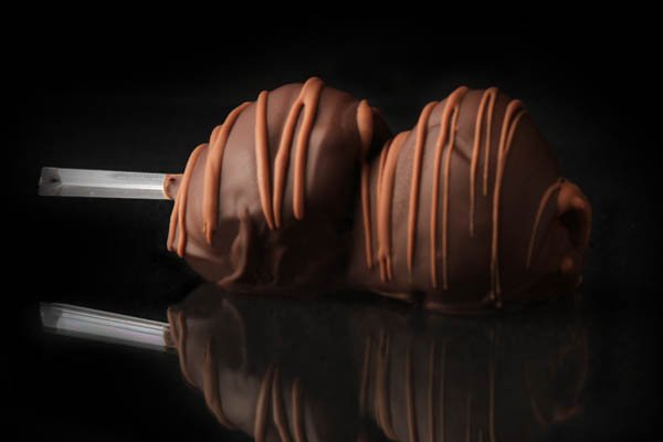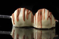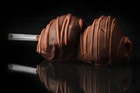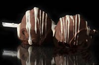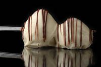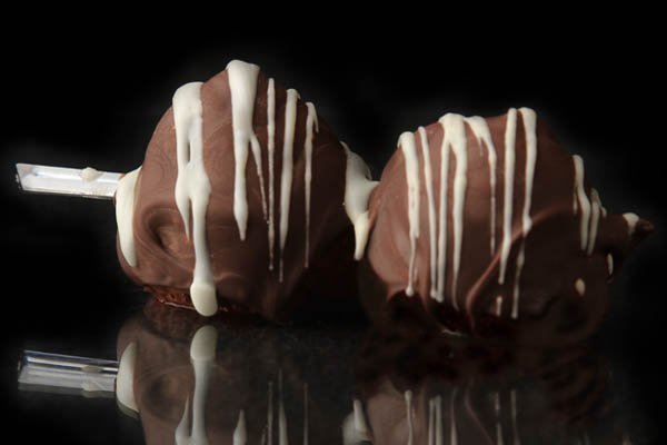 Two skewered strawberries lavishly drizzled with Milk, Dark, or White chocolate enhanced with