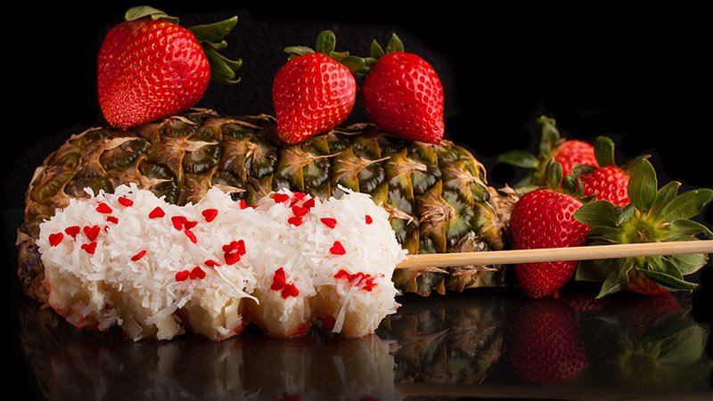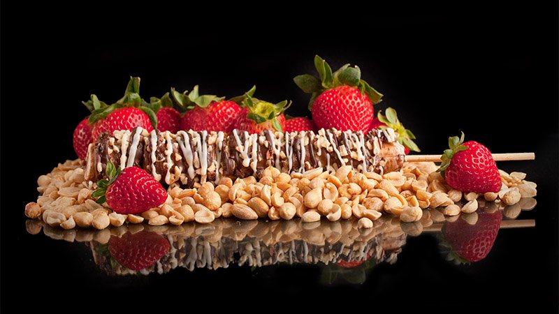 - 3 fruits on a skewer layered with 2 chocolate choices (substitutions such as creme puff, brownie, banana or pineapple included)